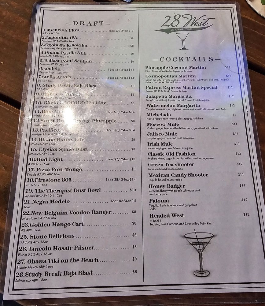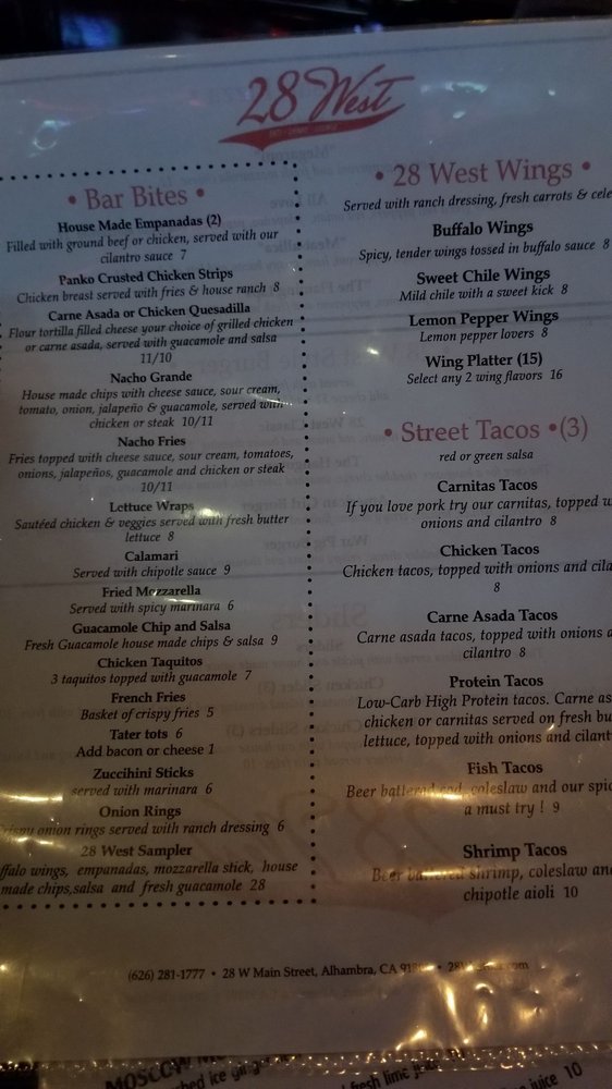 Introducing 28 West, an American restaurant in Alhambra, CA, known for its vibrant atmosphere and diverse menu. With options for vegetarians and a range of amenities like outdoor seating, DJ entertainment, and happy hour specials, 28 West offers a unique dining experience. Customers rave about the food and drinks, with highlights including sliders, wings, and flavorful cocktails like the watermelon margarita. The restaurant's casual vibe and dynamic ambiance make it a popular spot for groups and celebrations. While some reviews mention longer wait times for drinks, the overall consensus is positive, praising the friendly staff and lively environment. Whether you're looking to enjoy a night out with friends or host a private event, 28 West promises a memorable dining experience with a Latinx-owned touch.